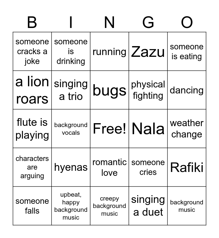 This bingo card has a free space and 24 words: hyenas, upbeat, happy background music, bugs, someone falls, someone is eating, someone cracks a joke, a lion roars, someone is drinking, Nala, romantic love, physical fighting, flute is playing, someone cries, Rafiki, singing a trio, singing a duet, weather change, running, dancing, background vocals, background music, characters are arguing, Zazu and creepy background music.