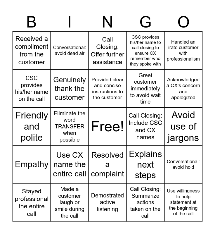 This bingo card has a free space and 24 words: Use CX name the entire call, Made a customer laugh or smile during the call, Provided clear and concise instructions to the customer, Stayed professional the entire call, Handled an irate customer with professionalism, Received a compliment from the customer, CSC provides his/her name on the call, Conversational: avoid dead air, Call Closing: Include CSC and CX names, Resolved a complaint, Greet customer immediately to avoid wait time, Friendly and polite, Explains next steps, Conversational: avoid hold, Genuinely thank the customer, Call Closing: Summarize actions taken on the call, Avoid use of jargons, Call Closing: Offer further assistance, Acknowledged a CX's concern and apologized, Eliminate the word TRANSFER when possible, Use willingness to help statement at the beginning of the call, Empathy, CSC provides his/her name to call closing to ensure CX remember who they spoke with and Demostrated active listening.