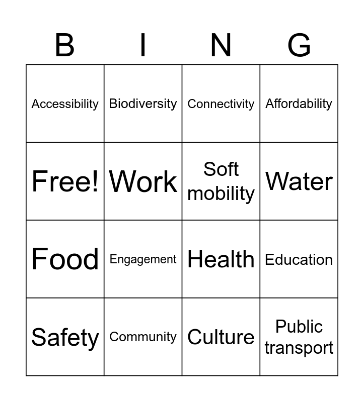 This bingo card has 16 words: Community, Education, Connectivity, Accessibility, Food, Biodiversity, Health, Culture, Free!, Work, Safety, Affordability, Engagement, Water, Soft mobility and Public transport.