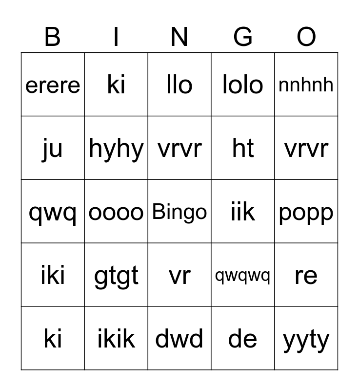 This bingo card has a free space and 28 words: re, bg, ht, de, ju, llo, ki, iki, iik, ki, qwq, lolo, ikik, dwd, vrvr, gt, gtgt, hyhy, vrvr, vr, erere, gtgt, yyty, oooo, popp, qwqwq, nnhnh and sasas.