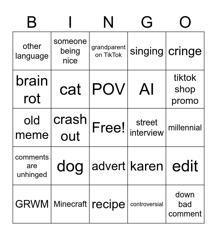 This bingo card has a free space and 24 words: dog, Minecraft, POV, GRWM, cringe, other language, brain rot, someone being nice, street interview, advert, AI, old meme, karen, edit, cat, controversial, millennial, grandparent on TikTok, tiktok shop promo, crash out, down bad comment, comments are unhinged, singing and recipe.