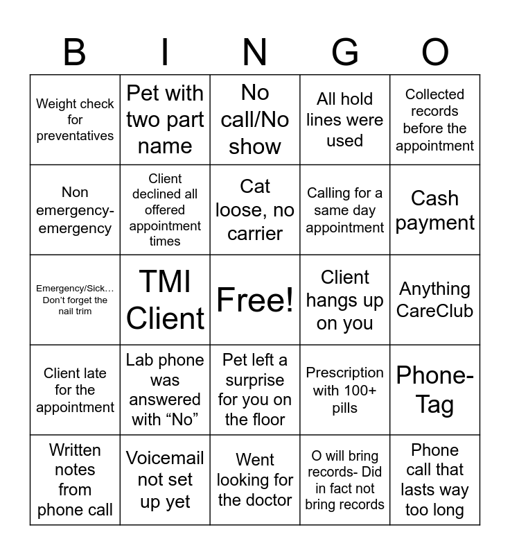 This bingo card has a free space and 24 words: Lab phone was answered with “No”, Voicemail not set up yet, Cat loose, no carrier, Written notes from phone call, Collected records before the appointment, Weight check for preventatives, Non emergency-emergency, Pet with two part name, Client hangs up on you, Pet left a surprise for you on the floor, Calling for a same day appointment, Emergency/Sick…Don’t forget the nail trim, Prescription with 100+ pills, Phone-Tag, Client declined all offered appointment times, O will bring records- Did in fact not bring records, Anything CareClub, No call/No show, Cash payment, TMI Client, Phone call that lasts way too long, Client late for the appointment, All hold lines were used and Went looking for the doctor.
