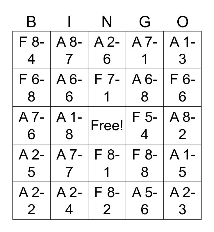 This bingo card has a free space and 96 words: F 5-1, F 5-2, F 5-3, F 5-4, F 5-5, F 5-6, F 5-7, F 5-8, F 6-1, F 6-2, F 6-3, F 6-4, F 6-5, F 6-6, F 6-7, F 6-8, F 7-1, F 7-2, F 7-3, F 7-4, F 7-5, F 7-6, F 7-7, F 7-8, F 8-1, F 8-2, F 8-3, F 8-4, F 8-5, F 8-6, F 8-7, F 8-8, A 1-1, A 1-2, A 1-3, A 1-4, A 1-5, A 1-6, A 1-7, A 1-8, A 2-1, A 2-2, A 2-3, A 2-4, A 2-5, A 2-6, A 2-7, A 2-8, A 3-1, A 3-2, A 3-3, A 3-4, A 3-5, A 3-6, A 3-7, A 3-8, A 4-1, A 4-2, A 4-3, A 4-4, A 4-5, A 4-6, A 4-7, A 4-8, A 5-1, A 5-2, A 5-3, A 5-4, A 5-5, A 5-6, A 5-7, A 5-8, A 6-1, A 6-2, A 6-3, A 6-4, A 6-5, A 6-6, A 6-7, A 6-8, A 7-1, A 7-2, A 7-3, A 7-4, A 7-5, A 7-6, A 7-7, A 7-8, A 8-1, A 8-2, A 8-3, A 8-4, A 8-5, A 8-6, A 8-7 and A 8-8.