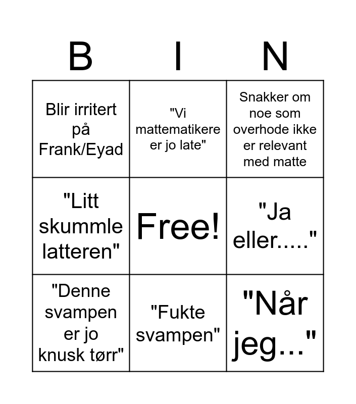 This bingo card has a free space and 9 words: "Denne svampen er jo knusk tørr", Snakker om noe som overhode ikke er relevant med matte, "Vi mattematikere er jo late", "Litt skummle latteren", Blir irritert på Frank/Eyad, "Ja eller.....", "Når jeg...", "Dere hvisker ikke så høyt som dere tror" and "Fukte svampen".
