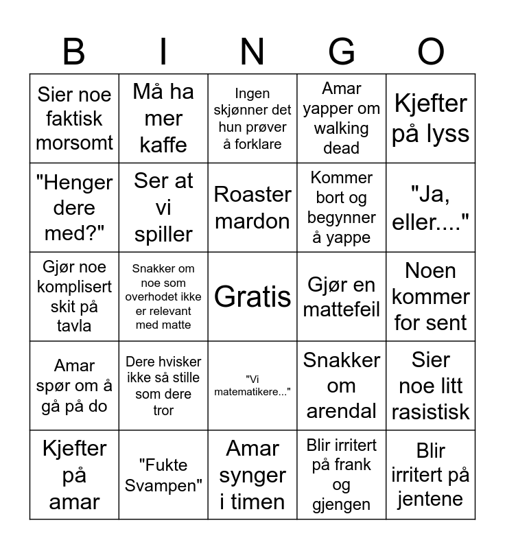 This bingo card has a free space and 24 words: Dere hvisker ikke så stille som dere tror, "Fukte Svampen", Roaster mardon, Kjefter på amar, Kjefter på lyss, Sier noe faktisk morsomt, "Henger dere med?", Må ha mer kaffe, Gjør en mattefeil, "Vi matematikere...", Kommer bort og begynner å yappe, Gjør noe komplisert skit på tavla, Snakker om arendal, Sier noe litt rasistisk, Ser at vi spiller, Blir irritert på frank og gjengen, Noen kommer for sent, Ingen skjønner det hun prøver å forklare, "Ja, eller....", Snakker om noe som overhodet ikke er relevant med matte, Blir irritert på jentene, Amar spør om å gå på do, Amar yapper om walking dead and Amar synger i timen.