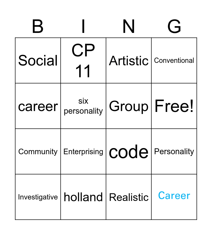 This bingo card has 1 images and 16 words: Realistic, Investigative, Artistic, Social, Enterprising, Conventional, Personality, Group, Free!, six personality, holland, code, career, CP 11, Community and do-er.