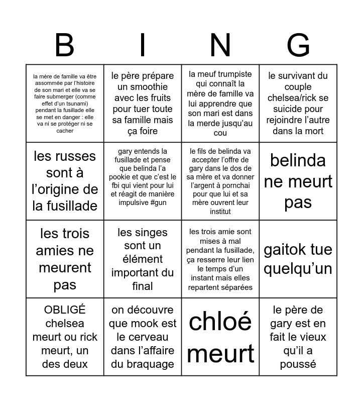 This bingo card has 16 words: on découvre que mook est le cerveau dans l’affaire du braquage, gaitok tue quelqu’un, la meuf trumpiste qui connaît la mère de famille va lui apprendre que son mari est dans la merde jusqu’au cou, la mère de famille va être assommée par l’histoire de son mari et elle va se faire submerger (comme effet d’un tsunami) pendant la fusillade elle se met en danger : elle va ni se protéger ni se cacher, les trois amies ne meurent pas, le père prépare un smoothie avec les fruits pour tuer toute sa famille mais ça foire, les trois amie sont mises à mal pendant la fusillade, ça resserre leur lien le temps d’un instant mais elles repartent séparées, chloé meurt, les russes sont à l’origine de la fusillade, gary entends la fusillade et pense que belinda l’a pookie et que c’est le fbi qui vient pour lui et réagit de manière impulsive #gun, OBLIGÉ chelsea meurt ou rick meurt, un des deux, le survivant du couple chelsea/rick se suicide pour rejoindre l’autre dans la mort, les singes sont un élément important du final, belinda ne meurt pas, le fils de belinda va accepter l’offre de gary dans le dos de sa mère et va donner l’argent à pornchai pour que lui et sa mère ouvrent leur institut and le père de gary est en fait le vieux qu’il a poussé.