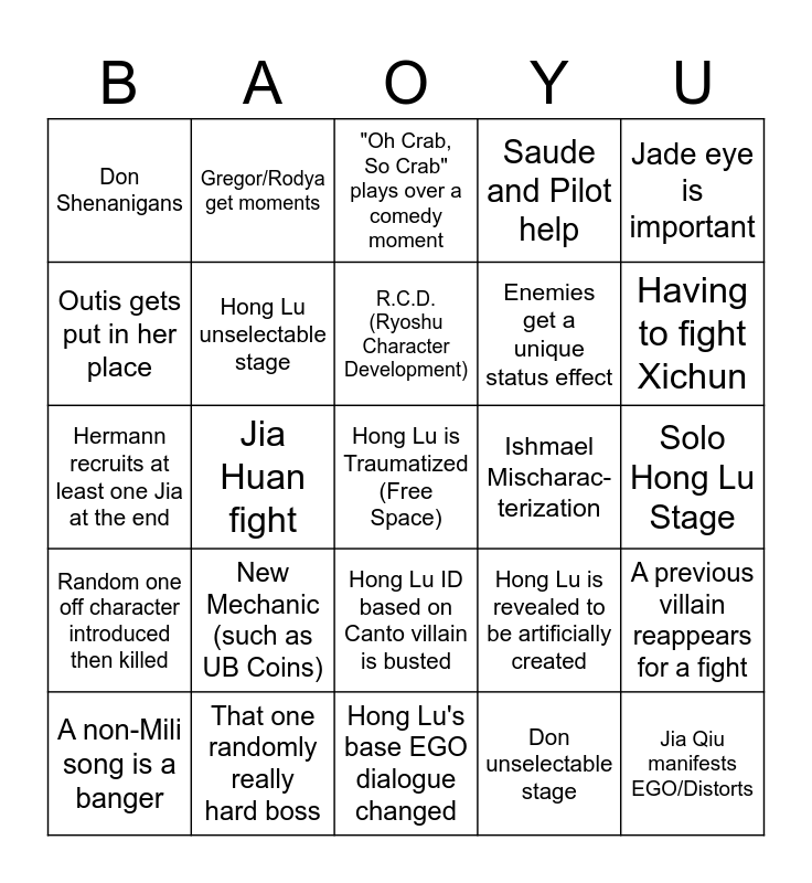 This bingo card has a free space and 24 words: New Mechanic (such as UB Coins), That one randomly really hard boss, R.C.D. (Ryoshu Character Development), A non-Mili song is a banger, Jade eye is important, Don Shenanigans, Outis gets put in her place, Gregor/Rodya get moments, Ishmael Mischarac- terization, Hong Lu ID based on Canto villain is busted, Enemies get a unique status effect, Hermann recruits at least one Jia at the end, Hong Lu is revealed to be artificially created, A previous villain reappears for a fight, Hong Lu unselectable stage, Don unselectable stage, Solo Hong Lu Stage, "Oh Crab, So Crab" plays over a comedy moment, Having to fight Xichun, Jia Huan fight, Jia Qiu manifests EGO/Distorts, Random one off character introduced then killed, Saude and Pilot help and Hong Lu's base EGO dialogue changed.