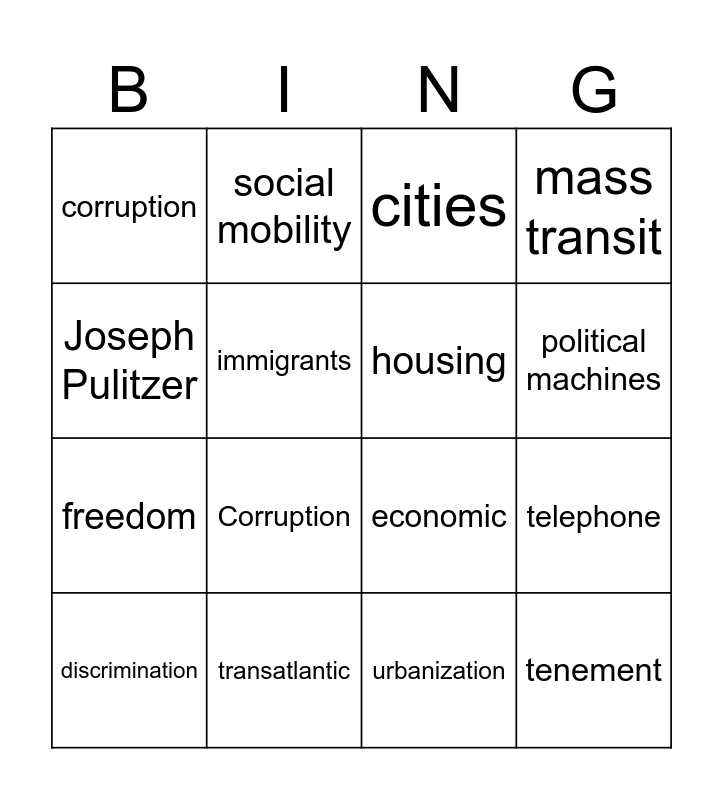 This bingo card has 16 words: transatlantic, telephone, cities, corruption, freedom, social mobility, economic, urbanization, Joseph Pulitzer, immigrants, discrimination, mass transit, Corruption, political machines, housing and tenement.