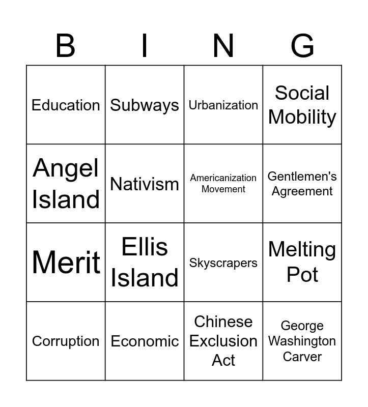 This bingo card has 16 words: Economic, Melting Pot, Urbanization, Education, Merit, Subways, Skyscrapers, Chinese Exclusion Act, Angel Island, Nativism, Corruption, Social Mobility, Ellis Island, Gentlemen's Agreement, Americanization Movement and George Washington Carver.