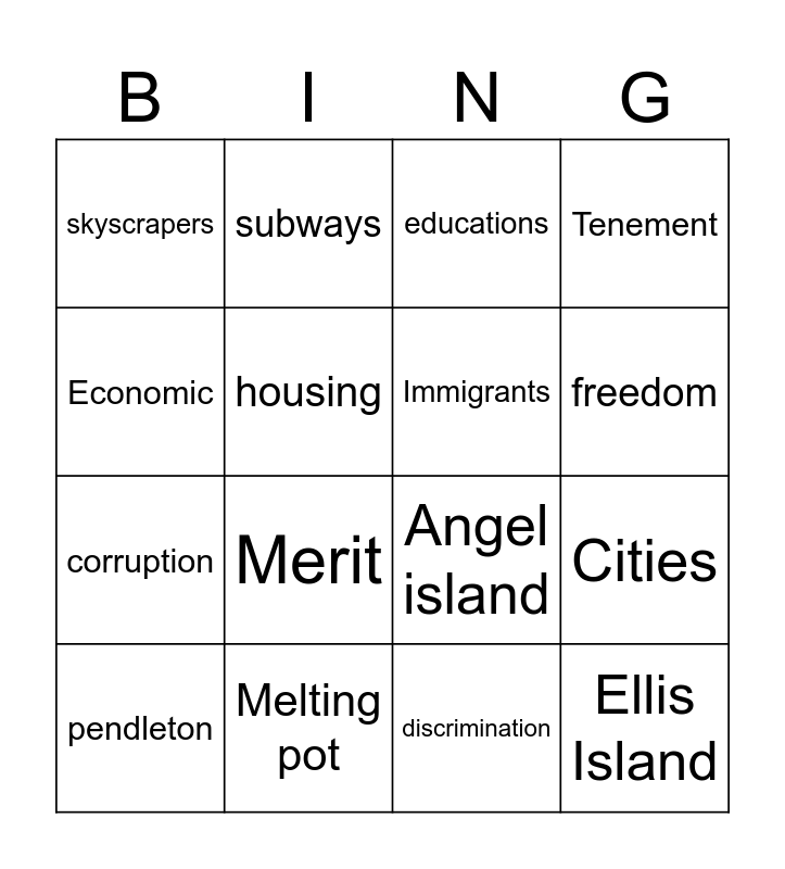 This bingo card has 16 words: Melting pot, Cities, educations, skyscrapers, corruption, subways, Angel island, discrimination, Economic, housing, pendleton, Tenement, Merit, freedom, Immigrants and Ellis Island.