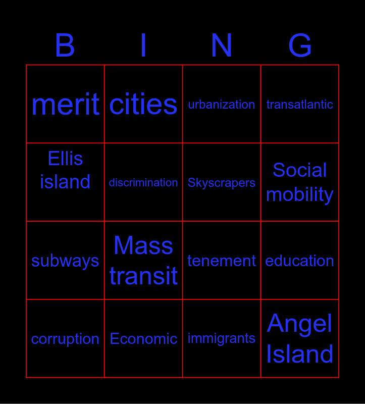 This bingo card has 16 words: Economic, education, urbanization, merit, subways, cities, tenement, immigrants, Ellis island, discrimination, corruption, transatlantic, Mass transit, Social mobility, Skyscrapers and Angel Island.