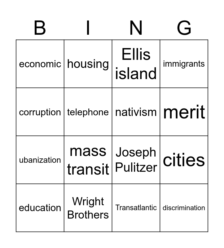 This bingo card has 16 words: Wright Brothers, cities, Ellis island, economic, ubanization, housing, Joseph Pulitzer, Transatlantic, corruption, telephone, education, immigrants, mass transit, merit, nativism and discrimination.