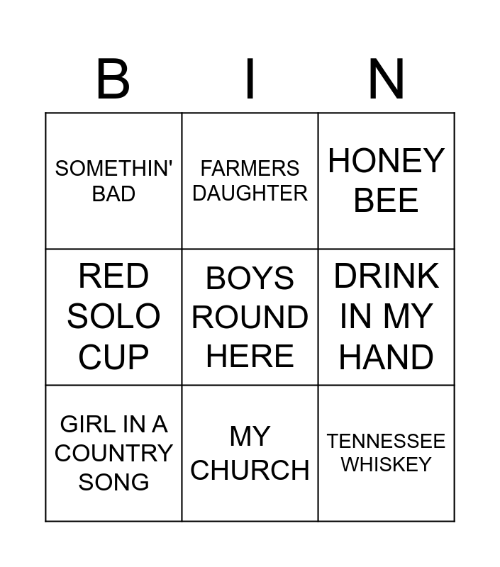 This bingo card has 60 words: LOVER LOVER, COME BACK SONG, COUNTRY GIRL SHAKE IT FOR ME, TRUCK YEAH, Free!, DRUNK ON A PLANE, GIRL IN A COUNTRY SONG, BUY ME A BOAT, TENNESSEE WHISKEY, HUNTIN FISHIN AND LOVIN EVERY DAY, RED SOLO CUP, WAGON WHEEL, DRINK IN MY HAND, STUCK LIKE GLUE, KNEE DEEP, SOMETHIN' BAD, SUNSHINE & WHISKEY, BOYS ROUND HERE, MEAN, MY CHURCH, RAIN IS A GOOD THING, HONEY BEE, HOUSE PARTY`, SOMETHIN BOUT A TRUCK, BODY LIKE A BACK ROAD, THIS IS HOW WE ROLL, MY KINDA PARTY, LOVE ME LIKE YOU MEAN IT, THATS MY KIND OF NIGHT, DIRT ROAD ANTHEM, WHERE I COME FROM, HOW COUNTRY FEELS, GOOD GIRL, PLAY IT AGAIN, FARMERS DAUGHTER, BEFORE HE CHEATS, SHE THINKS MY TRACTORS SEXY, TEQILA MAKES HER CLOTHES FALL OFF, ITS A FREAT DAY TO BE ALIVE, REDNECK WOMAN, SUDS IN THE BUCKET, SOMETHING LIKE THAT, PLAY SOMETHING COUNTRY, PICTUIRE, GUNPOWEFER & LEAD, HOLE IN THE BOTTLE, AMAZED, MY NEXT THIRTY YEARS, GOOD DIRECTIONS, WHERE I COME FROM, AUSTIN, THINGS A MAN OUGHTA KNOW, SAVE A HORSE RIDE A COWBOY, TOES, FANCY LIKE, HOMEGROWN, JUST ANOTHER DAY IN PARADISE, YOUR MAN, I LIKE IT I LOVE IT and WINE BEER WHISKEY.