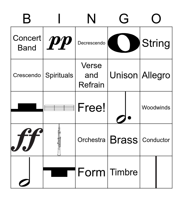 This bingo card has 10 images, a free space and 18 words: Conductor, Ostinato, Unison, Timbre, Crescendo, Decrescendo, Form, Allegro, repeated notes, Spirituals, Verse and Refrain, Orchestra, Concert Band, Final bar line, Woodwinds, Brass, String and Percussion.
