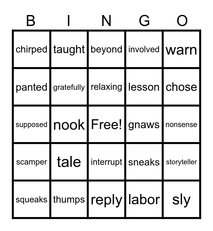 This bingo card has a free space and 35 words: anxious, bother, follow, gratefully, interrupt, involved, panted, pastime, relaxing, rush, supposed, warn, autumn, boldly, chirped, gnaws, labor, nook, scamper, sly, sneaks, squeaks, storyteller, thumps, beyond, chose, express, grand, lesson, nonsense, pretended, reply, tale, taught and wise.