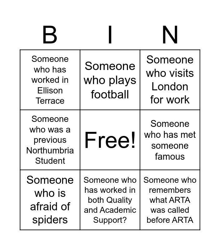 This bingo card has a free space and 27 words: Someone who wears glasses, Someone who has done a PAB in the last 2 months, Someone who is left handed, Someone who works with external companies/colleagues, Someone who has met someone famous, Someone who visits London for work, Someone who plays football, Someone who interacts with students, Someone who has a pet dog, Someone who has worked at Northumbria for over 20 years, Someone with the same birthday month as you, Someone who was a previous Northumbria Student, Someone who is an only child, Someone who is based at Coach Lane, Someone who has the same favourite colour as you, Someone who has secretaried a committee, Someone who is afraid of spiders, Someone who has worked in both Quality and Academic Support?, Someone who works/has worked in Business and Law faculty, Someone who has worked in Ellison Terrace, Someone who worked here when it was a Polytechnic, Someone who works/has worked in Health and Life Sciences faculty, Someone who has worked both in schools and faculties, Someone who works with employers, Someone who has worked here more than 25 years, Someone who remembers what ARTA was called before ARTA and Someone who remembers what system we used before SITS.