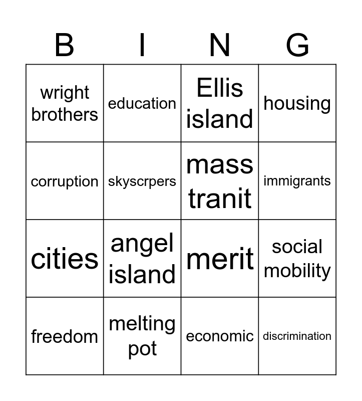 This bingo card has 16 words: melting pot, social mobility, Ellis island, wright brothers, cities, education, merit, economic, corruption, skyscrpers, freedom, housing, angel island, immigrants, mass tranit and discrimination.