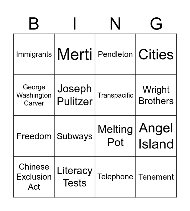 This bingo card has 16 words: Literacy Tests, Angel Island, Pendleton, Immigrants, Freedom, Merti, Melting Pot, Telephone, George Washington Carver, Joseph Pulitzer, Chinese Exclusion Act, Cities, Subways, Wright Brothers, Transpacific and Tenement.