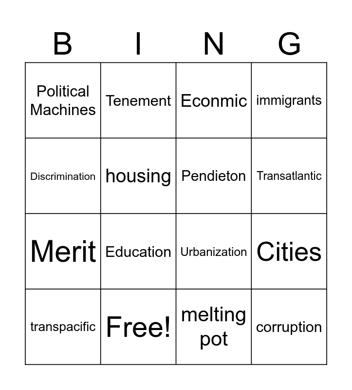 This bingo card has 25 words: telephone, Social Mobility, Transatlantic, Mass Transit, Discrimination, Political Machines, housing, Tenement, Free!, Literacy tests, Merit, Urbanization, Freedom, Ellis island, Pendieton, Americanization movement, melting pot, Econmic, Education, Cities, transpacific, Amusement parks, corruption, immigrants and subways.