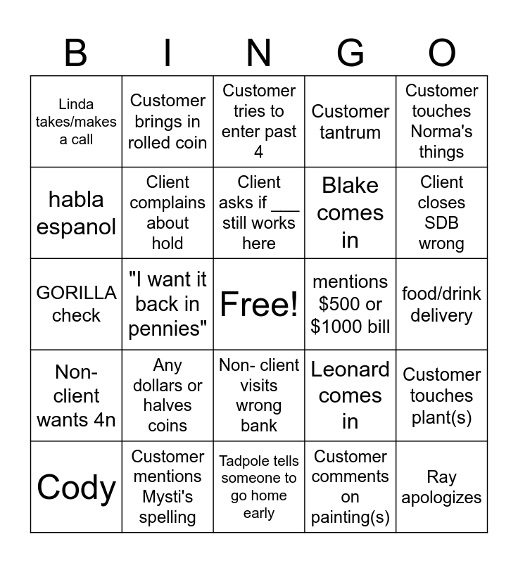 This bingo card has a free space and 39 words: POPCORN DAY!, Customer wants a Mo, Customer is a roofer, Client complains about hold, Cody, Non- client visits wrong bank, Client asks if ___ still works here, Mr. York brings his tractor, Customer touches Norma's things, Non-client wants 4n, "I want it back in pennies", Customer tantrum, Ray apologizes, food/drink delivery, mentions $500 or $1000 bill, Any dollars or halves coins, Customer complains about being asked for ID/SSN, Linda takes/makes a call, Non- Client Cash advance, Leonard comes in, habla espanol, Tadpole tells someone to go home early, Blake comes in, Client closes SDB wrong, non-client check > $10k, customer in last 5 min, asks for 100's when amount < $100, "She's prettier", Client wants Scott, Customer brings in rolled coin, Pollard deposit error, 4n rate complaint, Customer tries to enter past 4, Customer mentions Mysti's spelling, Customer comments on painting(s), Loomis comes before 12, Customer touches plant(s), GORILLA check and Leonard comes in WITH Trump apparel.