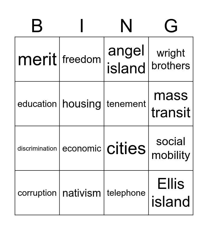 This bingo card has 16 words: nativism, social mobility, angel island, merit, discrimination, freedom, cities, telephone, education, housing, corruption, wright brothers, economic, mass transit, tenement and Ellis island.