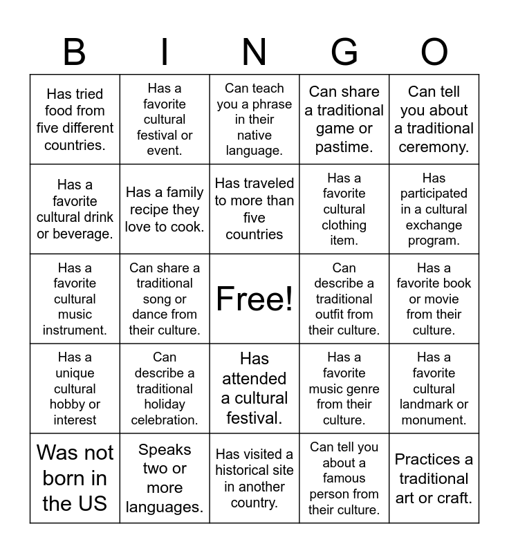 This bingo card has a free space and 30 words: Speaks two or more languages., Has lived in more than one country., Can share a traditional song or dance from their culture., Has a unique cultural tradition they celebrate., Has tried food from five different countries., Can teach you a phrase in their native language., Has a family recipe they love to cook., Has attended a cultural festival., Can describe a traditional outfit from their culture., Has visited a historical site in another country., Has a favorite book or movie from their culture., Practices a traditional art or craft., Can tell you about a famous person from their culture., Has a favorite cultural dish they enjoy., Has participated in a cultural exchange program., Can explain a cultural custom or etiquette., Has a favorite music genre from their culture., Has a unique cultural hobby or interest, Can describe a traditional holiday celebration., Can tell you about a traditional ceremony., Has a favorite cultural music instrument., Has participated in a cultural cooking class., Has a favorite cultural festival or event., Has a favorite cultural clothing item., Has a favorite cultural drink or beverage., Can share a traditional game or pastime., Has a favorite cultural landmark or monument., Was not born in the US, Has traveled to more than five countries and Has friends or family living in another country.