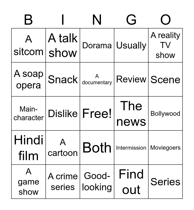 This bingo card has a free space and 24 words: A cartoon, A crime series, A documentary, A game show, A reality TV show, A sitcom, A soap opera, A talk show, The news, Both, Review, Main-character, Intermission, Moviegoers, Snack, Find out, Bollywood, Dorama, Scene, Dislike, Series, Hindi film, Usually and Good-looking.