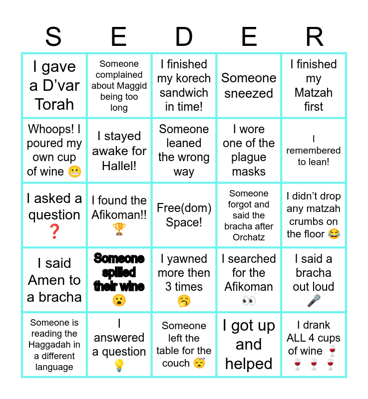 This bingo card has a free space and 24 words: Someone spilled their wine 😮, I answered a question💡, Someone leaned the wrong way, Someone is reading the Haggadah in a different language, I finished my Matzah first, I gave a D’var Torah, Whoops! I poured my own cup of wine 😬, Someone complained about Maggid being too long, Someone forgot and said the bracha after Orchatz, I yawned more then 3 times 🥱, I wore one of the plague masks, I asked a question ❓, I searched for the Afikoman 👀, I said a bracha out loud 🎤, I stayed awake for Hallel!, I got up and helped, I didn’t drop any matzah crumbs on the floor 😂, I finished my korech sandwich in time!, I remembered to lean!, I found the Afikoman!! 🏆, I drank ALL 4 cups of wine 🍷 🍷 🍷 🍷, I said Amen to a bracha, Someone sneezed and Someone left the table for the couch 😴.