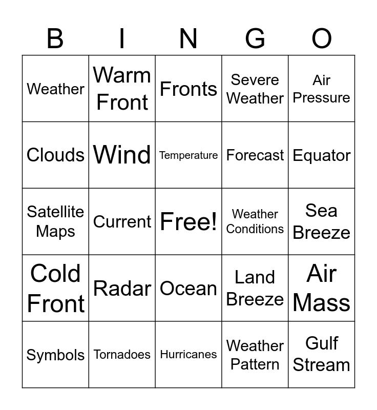 This bingo card has a free space and 28 words: Air Mass, Atmospheric Conditions, Forecast, Weather Pattern, Clouds, Fronts, Warm Front, Cold Front, Weather Conditions, Symbols, Satellite Maps, Severe Weather, Tornadoes, Hurricanes, Equator, Weather Balloons, Radar, Wind, Temperature, Ocean, Weather, Climate, Gulf Stream, Current, Sea Breeze, Land Breeze, Air Pressure and Coastal.