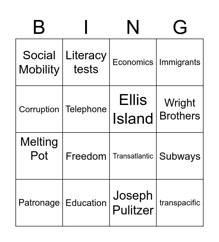 This bingo card has 16 words: Education, Subways, Economics, Social Mobility, Melting Pot, Literacy tests, Transatlantic, Joseph Pulitzer, Corruption, Telephone, Patronage, Immigrants, Freedom, Wright Brothers, Ellis Island and transpacific.