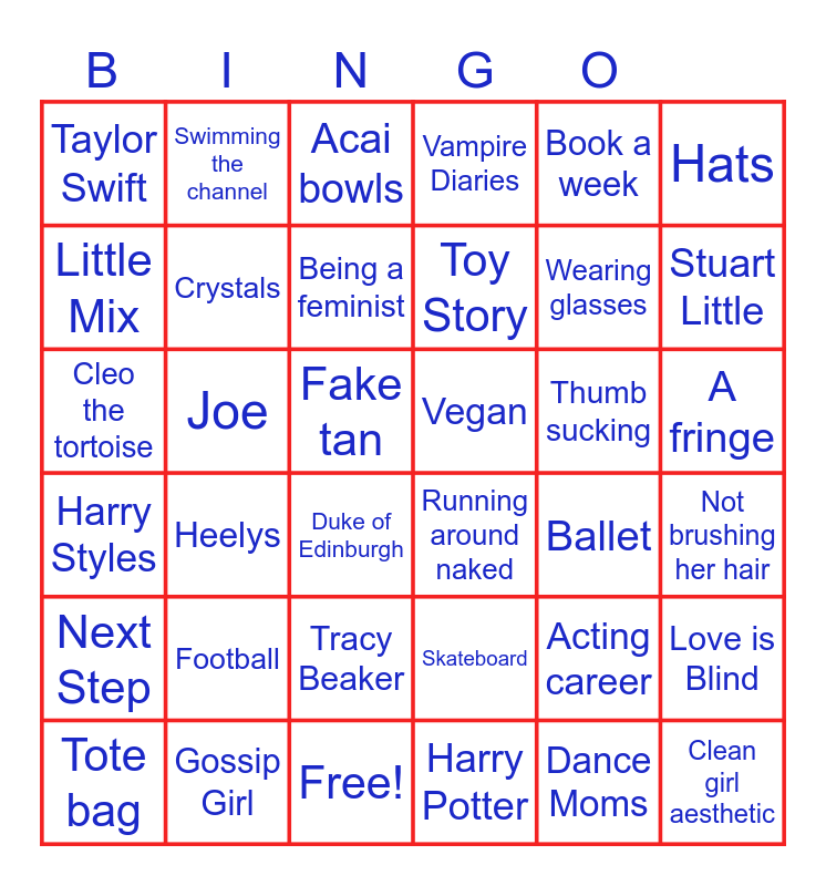 This bingo card has 39 words: Gossip Girl, Tote bag, Horse riding, Little Mix, Duke of Edinburgh, A fringe, Crystals, Clean girl aesthetic, Book a week, Vegan, Stuart Little, Vampire Diaries, Cleo the tortoise, Fake tan, Joe, Thumb sucking, Acting career, Taylor Swift, Free!, Harry Styles, Hats, Ballet, Being a feminist, Toy Story, Harry Potter, Tracy Beaker, Next Step, Dance Moms, Football, Swimming the channel, Homemade hair masks, Love is Blind, Acai bowls, Running around naked, Not brushing her hair, Skateboard, Heelys, Wearing glasses and Playing teachers.