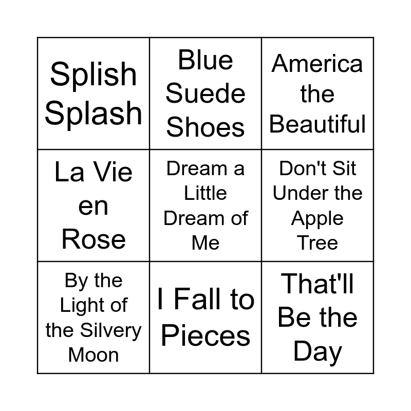 This bingo card has 9 words: By the Light of the Silvery Moon, America the Beautiful, Blue Suede Shoes, La Vie en Rose, Splish Splash, Don't Sit Under the Apple Tree, Dream a Little Dream of Me, That'll Be the Day and I Fall to Pieces.