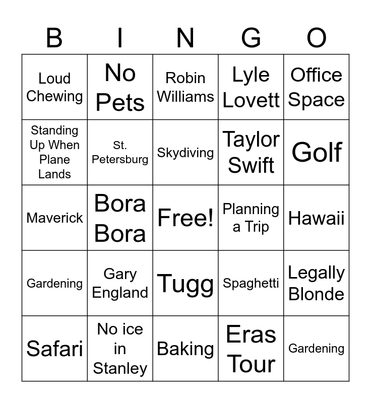 This bingo card has a free space and 188 words: London, Sanibel Island, Spain, Italy, Amsterdam, Maui, Greece, Montana, Seattle, Banff, Beach, Scotland, Tanzania, Moscow, Hawaii, Grand Cayman, Bora Bora, Destin, Greece, Antibes, Crete, Painting, Handy, Whistling, Gardening, Percussionist, Birthday Cakes, Piano, Planning a Trip, Juggling, Baking, Overthinking, Sleeping Anywhere, Rapping "Ice Ice Baby", Crosswords, Balloon Origami, Drummer, Pretzel Legs, Left-Handed, Organizing, Mean People, Lack of Preparedness, Cracking Knuckles, Arrogance, Surveys About Personal Things, Loud Talkers, "Persay" instead of "Per se", Chewing Ice, Noisy Eaters, Being Late, Loud Chewing, No ice in Stanley, Apostrophe Abuse, Humans Generally, Talking in 3rd Person, Slow in Left Lane, Blocking Intersection, Second-Hand Smoke, Whining, Procrastination, Standing Up When Plane Lands, Reading, Cooking, Teaching Dance, Philosophy, Gardening, Writing, Baking, Collecting Perfume, Golf, Basketball, Thrifting/Garage Sales, Photography, Travel Planning, Fishing, Walking Dogs, St. Petersburg, Australia, Dollywood, Beach House in Hawaii, Inca Trail, African Safari, Mexico, Scotland, Meet a Celebrity, Yellowstone, Hot Air Balloon, Skydiving, Churchill, Canada, Driving Coast to Coast, Safari, Everest Base Camp Trek, Northern Lights in Glass Igloo, Egypt, To Have No Bucket List, Greece, Rosebud, Sophie and Bear, Gertrude, Atticus, Bugsy, Mooseer, Ninja (a feline acquaintance), Norman, Audrey 2, Maverick, Frisco and Willow, Max and Millie, Remi, Mho, Pebbles, No Pets, Reese, Jax, Snowball, Booger (former), Winnie, Tugg, Fried Shrimp, Filet Mignon, Breakfast, Thai, Lobster Spaghetti, Spaghetti, Seafood Salad + White Wine, Chicken Fried Steak, Chips and Queso, Pasta, Deep Dish Chicago Pizza, Giordano's Thin Crust Pizza, Sushi, Hot Pot, Cheese Fondue, Sushi, Steak, James Marsden, Gary England, Robin Williams, Seth Rogen, Dr. J, Barry Sanders, Jill Raines, Ben Affleck, Anderson Cooper, Eden Sher, John Updike, Barry Foster, Derek Jeter, Lyle Lovett, Sylvester Stallone, James Gandolfini, Toby Keith, James Marsden, Taylor Swift, Spouse, Elizabeth Garrett, Einstein, Billy, Parent(s), Oprah, Grandmother, Laura Palk, Ursula K. Le Guin, Clint Eastwood, Grandfather, Joe C, Michelle Obama, Spongebob, Eras Tour, Goonies, Dirty Dancing, Big Lebowski, Fight Club, Napoleon Dynamite, Cinderella 3, 40-Year-Old Virgin, Mrs. Doubtfire, Godfather, Frozen, Legally Blonde, Harry Potter, Young Frankenstein, It’s a Wonderful Life, A Few Good Men, Office Space, Matrix, Coneheads and Broadchurch.
