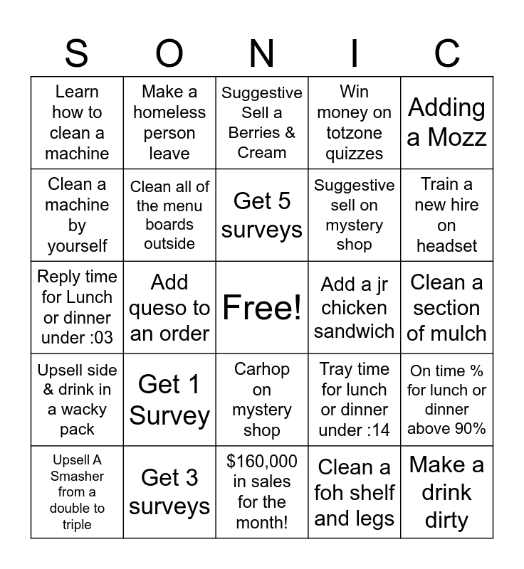 This bingo card has a free space and 24 words: Get 1 Survey, Get 3 surveys, Get 5 surveys, Upsell A Smasher from a double to triple, Adding a Mozz, Learn how to clean a machine, Clean a machine by yourself, Make a homeless person leave, Add a jr chicken sandwich, Carhop on mystery shop, Suggestive sell on mystery shop, Reply time for Lunch or dinner under :03, Tray time for lunch or dinner under :14, On time % for lunch or dinner above 90%, Clean all of the menu boards outside, Clean a foh shelf and legs, Clean a section of mulch, Suggestive Sell a Berries & Cream, Train a new hire on headset, Add queso to an order, Make a drink dirty, Upsell side & drink in a wacky pack, Win money on totzone quizzes and $160,000 in sales for the month!.