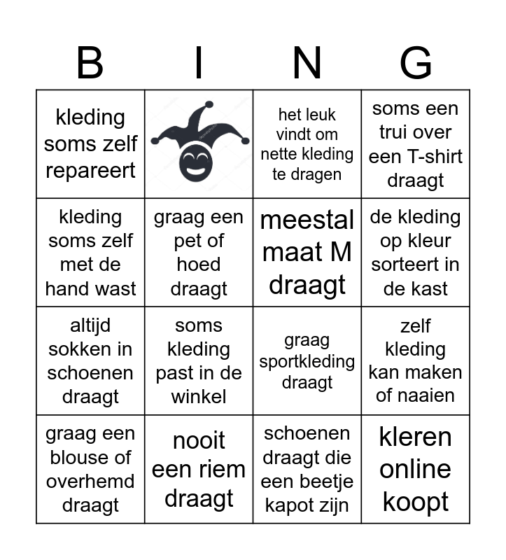 This bingo card has 1 images and 18 words: graag sportkleding draagt, zijn of haar kleding graag strijkt, het leuk vindt om nette kleding te dragen, kleren online koopt, zelf kleding kan maken of naaien, kleding soms zelf met de hand wast, schoenen draagt die een beetje kapot zijn, kleding soms zelf repareert, altijd sokken in schoenen draagt, soms kleding past in de winkel, graag een pet of hoed draagt, meestal maat M draagt, nooit een riem draagt, graag een blouse of overhemd draagt, in de zomer slippers draagt, soms een trui over een T-shirt draagt, de kleding op kleur sorteert in de kast and geen paarse kleding heeft.