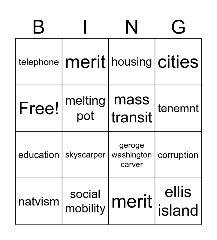This bingo card has 16 words: social mobility, corruption, housing, telephone, education, merit, geroge washington carver, merit, Free!, melting pot, natvism, cities, skyscarper, tenemnt, mass transit and ellis island.