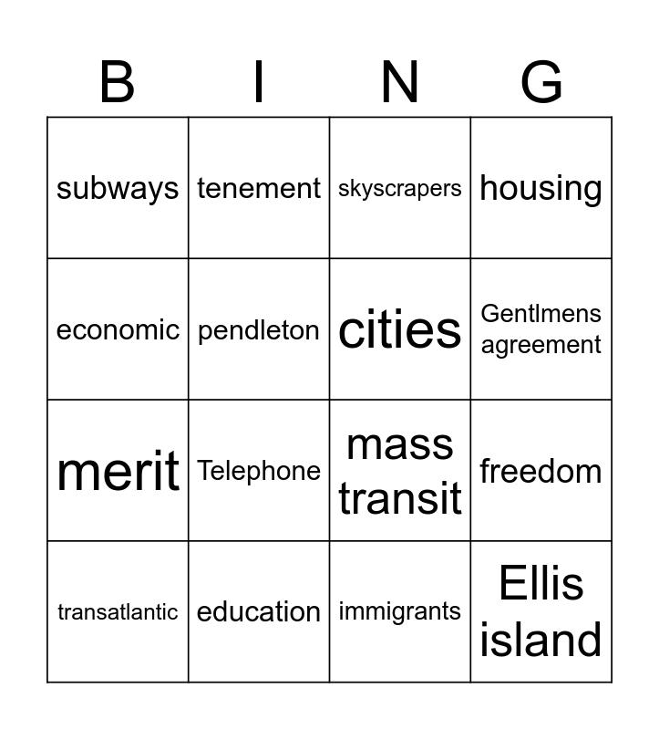 This bingo card has 16 words: education, freedom, skyscrapers, subways, merit, tenement, mass transit, immigrants, economic, pendleton, transatlantic, housing, Telephone, Gentlmens agreement, cities and Ellis island.