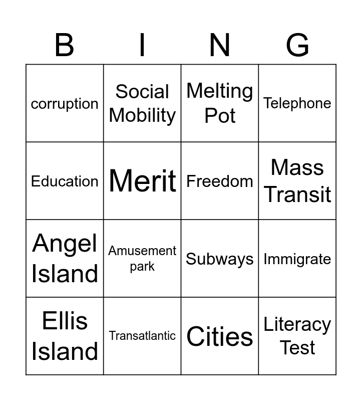 This bingo card has 16 words: Transatlantic, Immigrate, Melting Pot, corruption, Angel Island, Social Mobility, Subways, Cities, Education, Merit, Ellis Island, Telephone, Amusement park, Mass Transit, Freedom and Literacy Test.