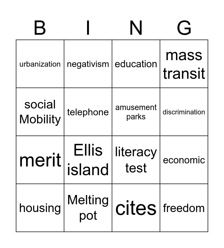 This bingo card has 16 words: Melting pot, economic, education, urbanization, merit, negativism, literacy test, cites, social Mobility, telephone, housing, mass transit, Ellis island, discrimination, amusement parks and freedom.