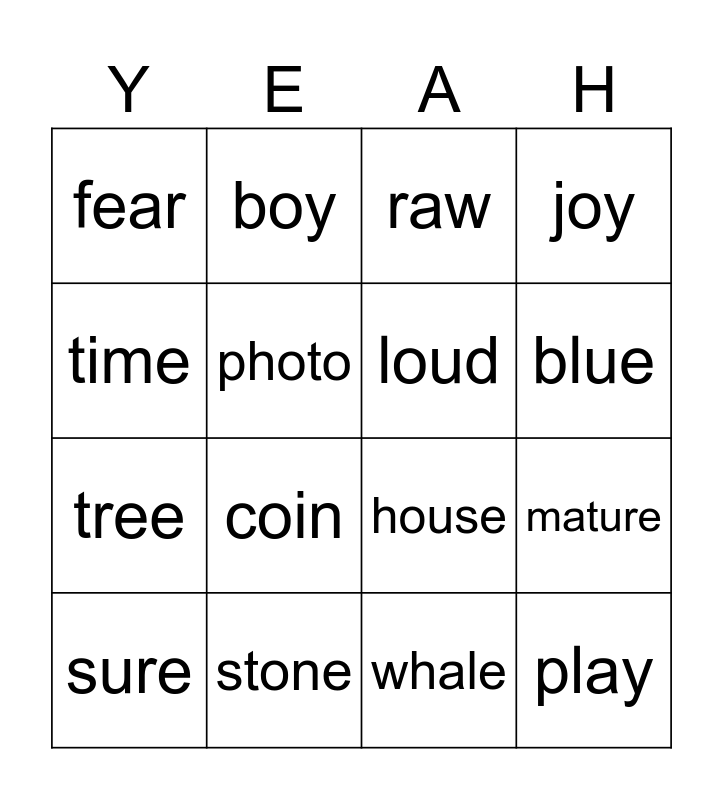 This bingo card has 32 words: near, chair, mature, term, play, loud, time, cheese, boy, bird, blue, raw, where, phone, stone, name, dear, house, time, first, play, girl, whale, raw, sure, joy, tree, photo, fear, five, theme and coin.