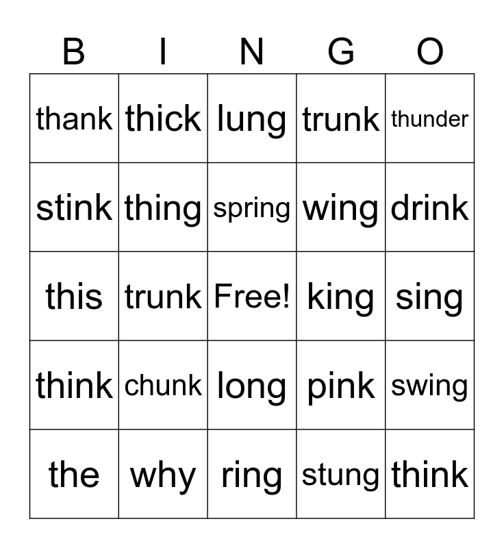 This bingo card has a free space and 29 words: the, wink, trunk, sang, thank, lung, thing, chunk, king, why, sing, think, ring, stung, drink, bank, long, think, thunder, this, pink, tank, wing, stink, trunk, thick, swing, spring and theft.