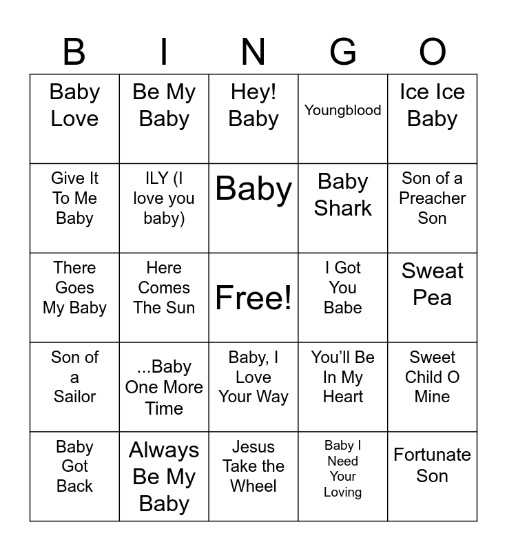 This bingo card has a free space and 24 words: ...Baby One More Time, Always Be My Baby, Baby, Baby Got Back, Ice Ice Baby, Baby Love, Give It To Me Baby, Be My Baby, I Got You Babe, Baby, I Love Your Way, Baby Shark, There Goes My Baby, You’ll Be In My Heart, Sweet Child O Mine, ILY (I love you baby), Baby I Need Your Loving, Sweat Pea, Hey! Baby, Son of a Preacher Son, Here Comes The Sun, Fortunate Son, Son of a Sailor, Youngblood and Jesus Take the Wheel.