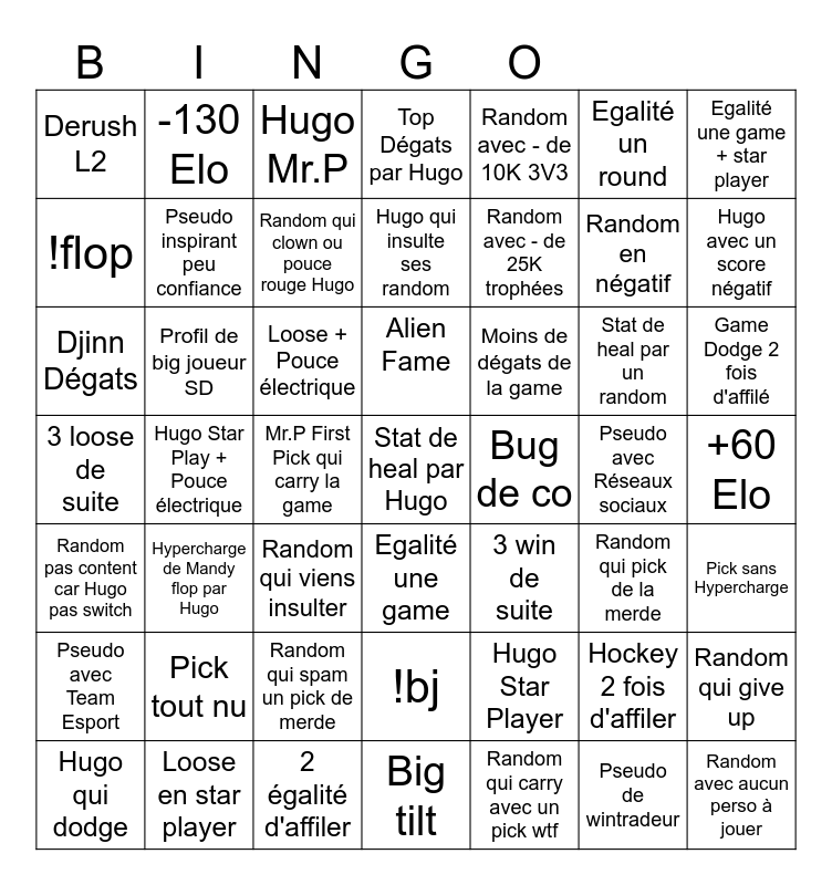 This bingo card has a free space and 48 words: Hugo Star Player, Random en négatif, Big tilt, Hugo Star Play + Pouce électrique, Loose + Pouce électrique, +60 Elo, -130 Elo, Loose en star player, Egalité un round, Egalité une game, Egalité une game + star player, Top Dégats par Hugo, Stat de heal par un random, Moins de dégats de la game, Pseudo avec Team Esport, Pseudo avec Réseaux sociaux, !flop, Hugo avec un score négatif, Hockey 2 fois d'affiler, Random avec - de 10K 3V3, Random avec - de 25K trophées, Mr.P First Pick qui carry la game, Derush L2, Pseudo inspirant peu confiance, Random qui give up, Random qui clown ou pouce rouge Hugo, Game Dodge 2 fois d'affilé, Hugo qui dodge, Alien Fame, Profil de big joueur SD, Pseudo de wintradeur, Bug de co, Pick sans Hypercharge, Pick tout nu, 3 loose de suite, 3 win de suite, Random qui pick de la merde, Djinn Dégats, Random qui viens insulter, Random qui spam un pick de merde, Random pas content car Hugo pas switch, Random avec aucun perso à jouer, Hugo Mr.P, 2 égalité d'affiler, Hugo qui insulte ses random, !bj, Hypercharge de Mandy flop par Hugo and Random qui carry avec un pick wtf.