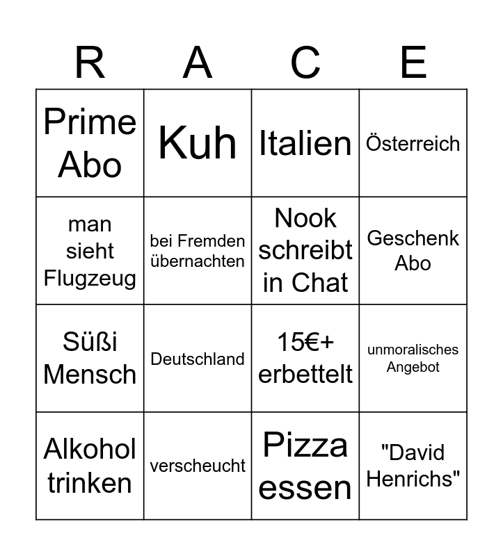 This bingo card has 16 words: verscheucht, unmoralisches Angebot, Italien, Prime Abo, Süßi Mensch, Kuh, 15€+ erbettelt, Pizza essen, man sieht Flugzeug, bei Fremden übernachten, Alkohol trinken, Österreich, Deutschland, Geschenk Abo, Nook schreibt in Chat and "David Henrichs".