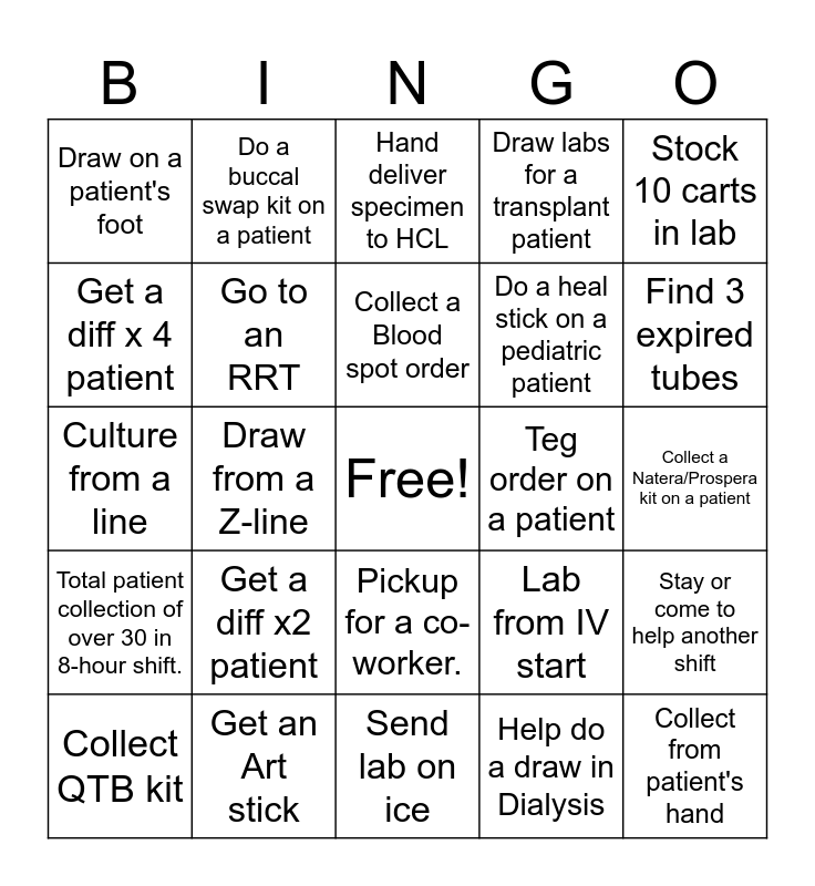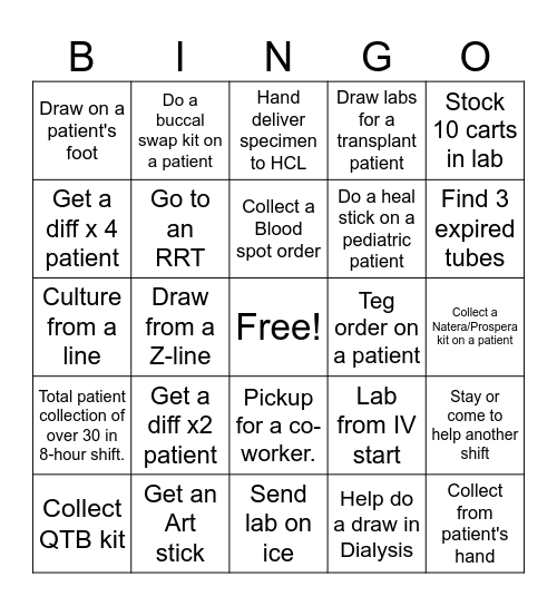 This bingo card has a free space and 24 words: Get a diff x2 patient, Get an Art stick, Collect a Blood spot order, Collect QTB kit, Stock 10 carts in lab, Draw on a patient's foot, Get a diff x 4 patient, Do a buccal swap kit on a patient, Teg order on a patient, Pickup for a co-worker., Do a heal stick on a pediatric patient, Culture from a line, Lab from IV start, Stay or come to help another shift, Go to an RRT, Help do a draw in Dialysis, Collect a Natera/Prospera kit on a patient, Hand deliver specimen to HCL, Find 3 expired tubes, Draw from a Z-line, Collect from patient's hand, Total patient collection of over 30 in 8-hour shift., Draw labs for a transplant patient and Send lab on ice.