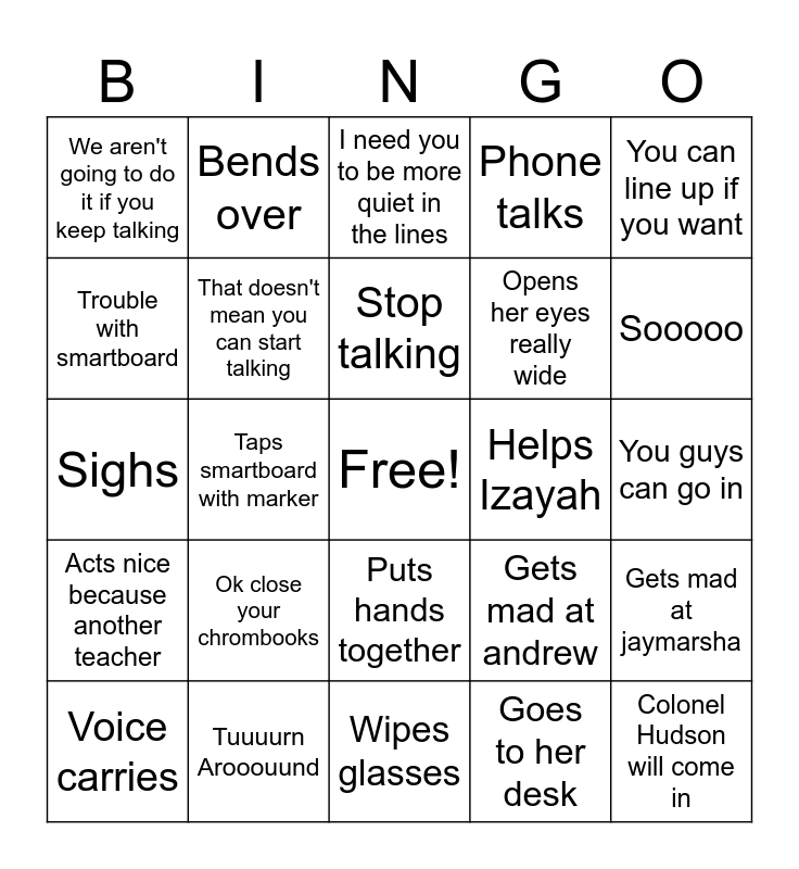 This bingo card has a free space and 24 words: Ok close your chrombooks, Tuuuurn Arooouund, Stop talking, Voice carries, You can line up if you want, We aren't going to do it if you keep talking, Trouble with smartboard, Bends over, Helps Izayah, Puts hands together, Opens her eyes really wide, Sighs, Gets mad at andrew, Gets mad at jaymarsha, That doesn't mean you can start talking, Goes to her desk, You guys can go in, I need you to be more quiet in the lines, Sooooo, Taps smartboard with marker, Colonel Hudson will come in, Acts nice because another teacher, Phone talks and Wipes glasses.