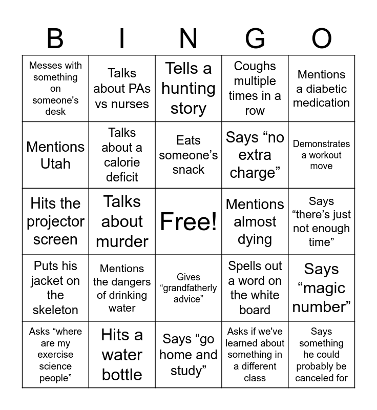 This bingo card has a free space and 24 words: Mentions the dangers of drinking water, Hits a water bottle, Eats someone’s snack, Asks “where are my exercise science people”, Mentions a diabetic medication, Messes with something on someone's desk, Mentions Utah, Talks about PAs vs nurses, Mentions almost dying, Gives “grandfatherly advice”, Says “no extra charge”, Hits the projector screen, Spells out a word on the white board, Says “magic number”, Talks about a calorie deficit, Asks if we've learned about something in a different class, Says “there’s just not enough time”, Tells a hunting story, Demonstrates a workout move, Talks about murder, Says something he could probably be canceled for, Puts his jacket on the skeleton, Coughs multiple times in a row and Says “go home and study”.