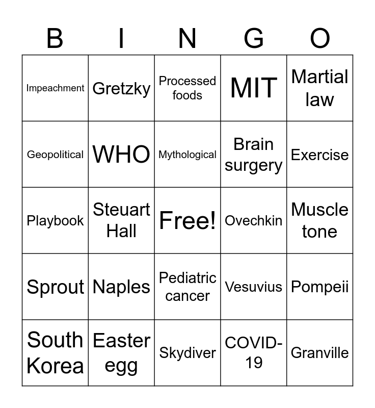 This bingo card has a free space and 24 words: Naples, Easter egg, Mythological, South Korea, Martial law, Impeachment, Geopolitical, Gretzky, Ovechkin, Pediatric cancer, Brain surgery, Playbook, Vesuvius, Pompeii, WHO, COVID-19, Muscle tone, Processed foods, Exercise, Steuart Hall, Granville, Sprout, MIT and Skydiver.
