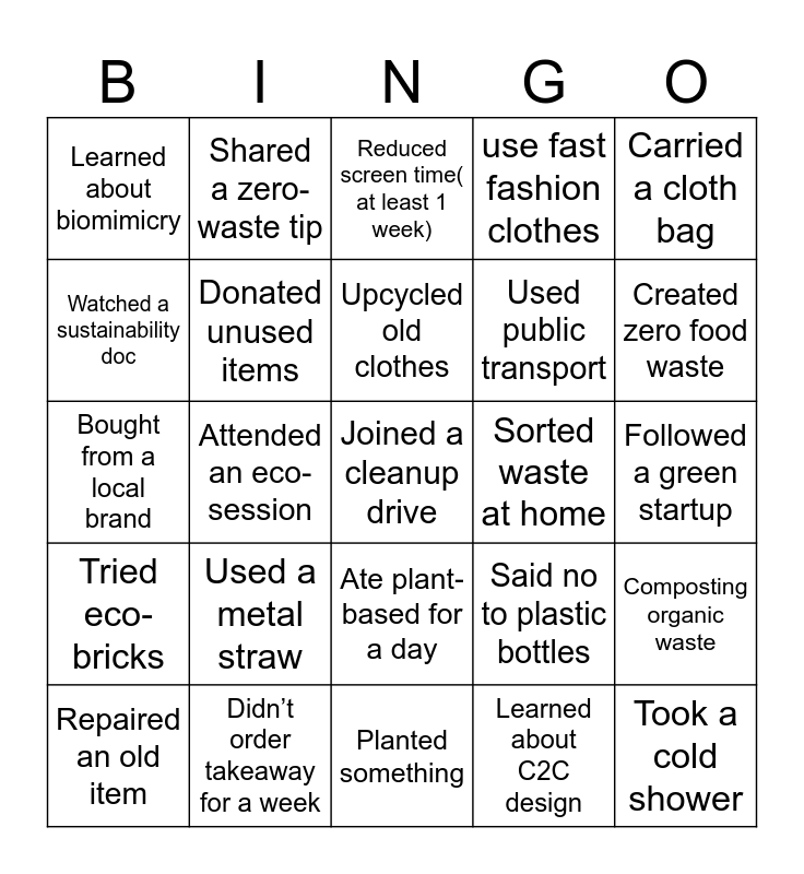 This bingo card has a free space and 24 words: Used a metal straw, Didn’t order takeaway for a week, Upcycled old clothes, Repaired an old item, Carried a cloth bag, Learned about biomimicry, Watched a sustainability doc, Shared a zero-waste tip, Sorted waste at home, Ate plant-based for a day, Used public transport, Bought from a local brand, Said no to plastic bottles, Composting organic waste, Donated unused items, Learned about C2C design, Followed a green startup, Reduced screen time( at least 1 week), Created zero food waste, Attended an eco-session, Took a cold shower, Tried eco-bricks, use fast fashion clothes and Planted something.